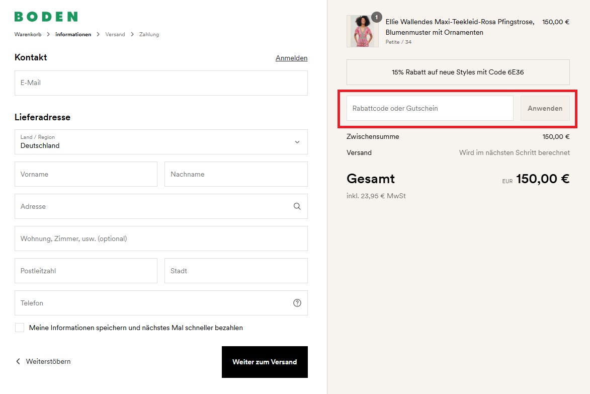 - Fügt hier mit „Strg. + V“ auf der Tastatur den Boden Rabattcode ein und vergesst nicht, ihn mit einem Klick auf „Anwenden“ zu aktivieren. Euer Boden Rabatt wird anschließend direkt auf die Bestellsumme angerechnet.
