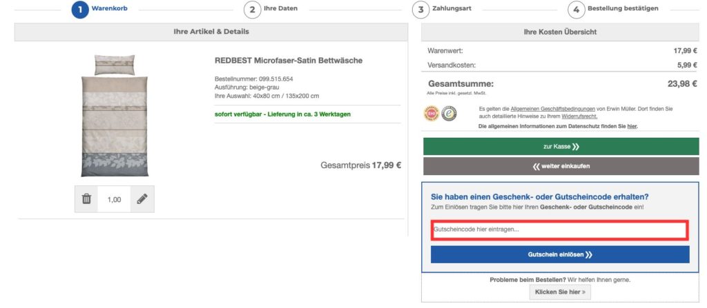 Wenn ihr euch bei uns einen kostenlosen Erwin Müller Gutscheincode ausgesucht habt, könnt ihr ihn in nur wenigen Schritten einlösen: